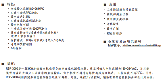 RSP-3000是一款3KW单组输出机壳型交流变直流电源供应器。整系列输入电压范围为180~264VAC,并且能提供可满足大部分工业需求的直流输出。每个机型可通过内部控速风扇来风冷,工作温度可达70℃。另外RSP-3000利用内建多种功能如输出电压可调整,均流,遥控开/关控制,辅助电源等功能提供多种设计灵活性。