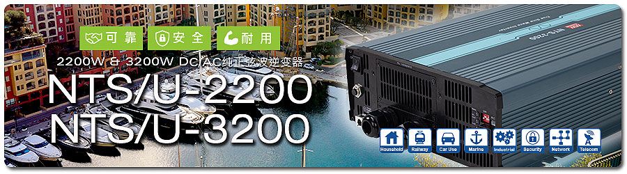 明纬逆变器NTS/ NTU-2200/ 3200有别于一般市售消费性等级,最大特色是采工业级高可靠、高安全性、高质量并融入环保高效能概念设计,且导入全新数字化智能芯片及严选用料。主要特点有 : 瞬间功率可达2倍、可弹性自调AC输出电压/频率及节能模式、远程ON/OFF遥控、多重智能保护(异常自动关机)、可操作于-25~+70℃、规划有欧/美/中国/万用插及端子台式多种AC输出插座、通过国际认证及3年长效保固…等。适用于家用/办公室、车用、游艇、偏远地区无AC电力网、移动式AC行动电源、安控与消防备援不断电系统…等场合,如:驱动电视、计算机、手机充电、音响、照明、电扇、移动式医用推车、移动式灯塔…等。