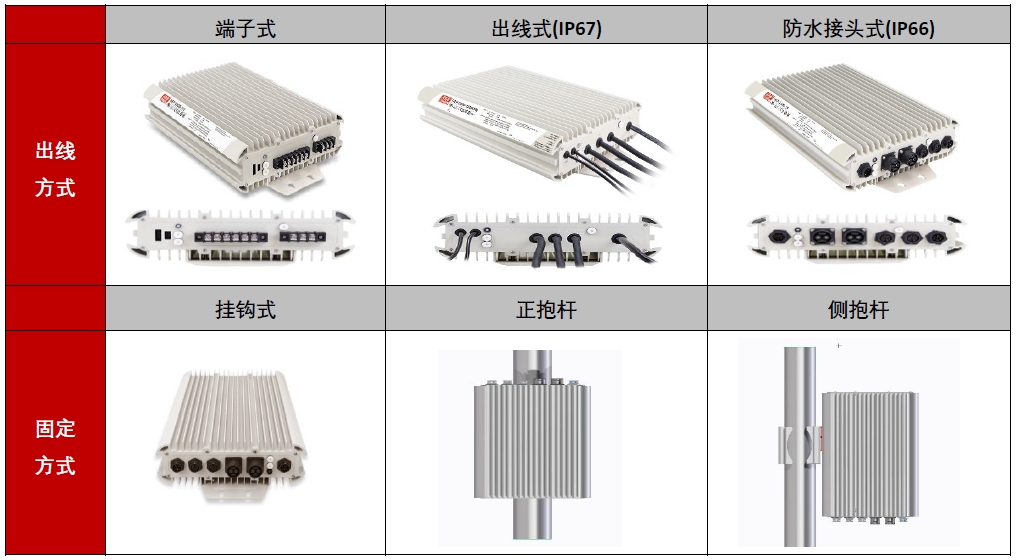 HEP-2300系列除提供不同的输出电压,亦提供三种接线方式,包含传统端子式、防水出线式及防水接头式,尤其防水接头版本,可针对目前4G通讯射频设备RRU(Remote Radio Unit)及5G通讯的主动式天线AAU(Active Antenna Unit)搭配使用,可使用于户外基地站,亦提供不同固定方式如挂钩式,正抱杆或侧抱杆等方式。若您需要搭配不同线材使用,明纬亦可提供完整线材修改服务,请与明纬业务代表联络。