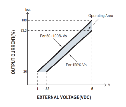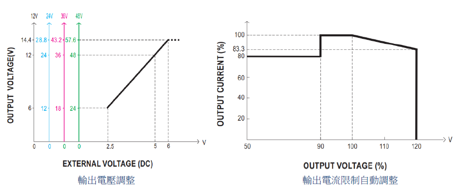 如图二输出电压控制曲线所示,UHP-1000输出电压可以透过直流电压讯号2.5V至6V,让输出电压于额定电压50%至120%范围内进行调整。在使用PV功能时,最大输出电流限制会根据设定的输出电压进行自动调整,建议客户依输出电压需求执行相关降载要求,以防止产品过热或触发保护。