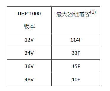 注解 1: 该值是针对额定电流为110%的恒定电流充电给出的,电容器组直接连接到UHP-1000,而没有限流装置。