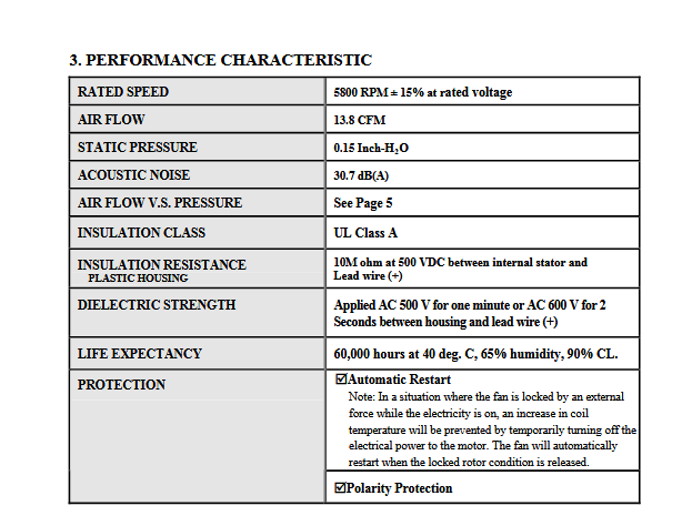 V1系列 尺寸50*50*10MM 电压:12V 功率:0.84W 转速:5800RPM 风量:13.8CFM 风压:0.15inch-H 噪音:30.7DBA 重量:19.5G