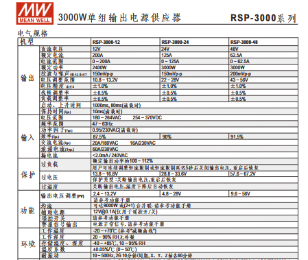 RSP-3000是一款3KW单组输出机壳型交流变直流电源供应器。整系列输入电压范围为180~264VAC,并且能提供可满足大部分工业需求的直流输出。每个机型可通过内部控速风扇来风冷,工作温度可达70℃。另外RSP-3000利用内建多种功能如输出电压可调整,均流,遥控开/关控制,辅助电源等功能提供多种设计灵活性。